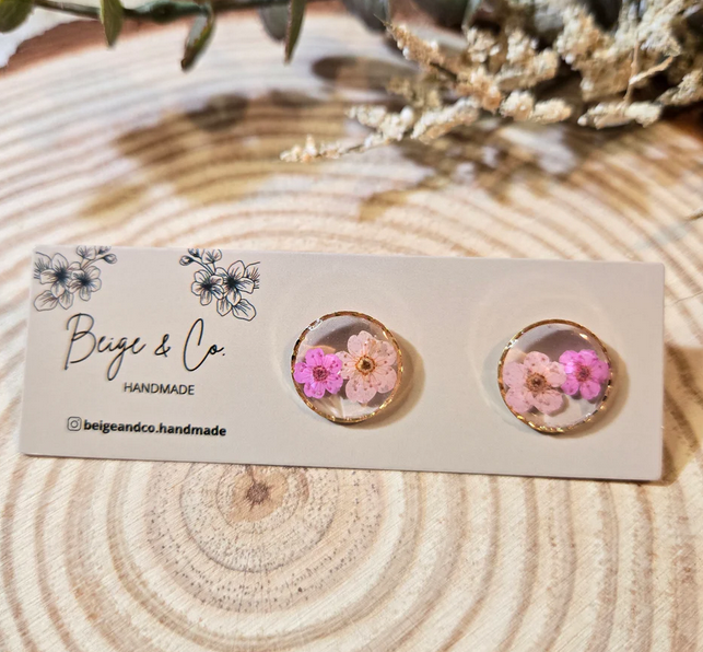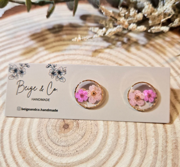 A cute pair of stud earrings featuring two pressed flowers inside.