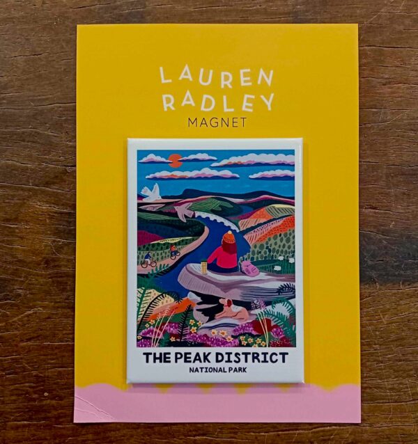 A colourful tin plate magnet featuring a design of the Peak District National Park.